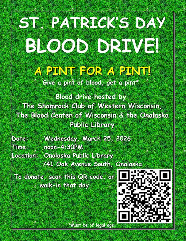 25th-A Pint for a Pint-Shamrock Club Blood Drive at Onalaska Public Library 12PM-4:30PM
