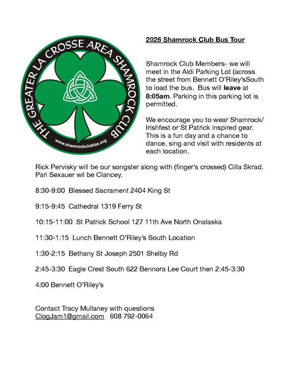 17th-St. Patrick's Day-Bus Trip to area School's and Nursing Homes. Meet at Bennett O'Riley's South at 8AM.