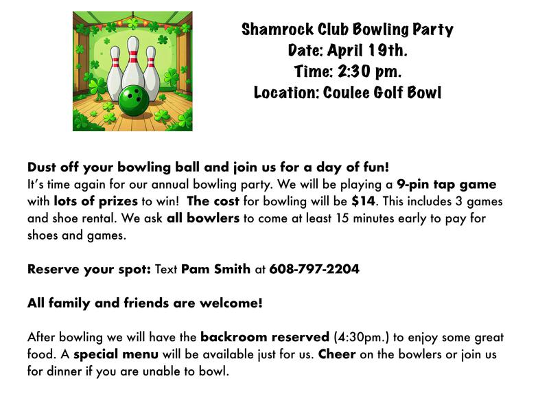 19th-Shamrock Club Nine Pin Bowling at the Coulee Golf Bowl 2:30PM-Prizes and Shenanigans. Limited Menu Dinner afterwords at 4:30 PM. Come early to check-in.